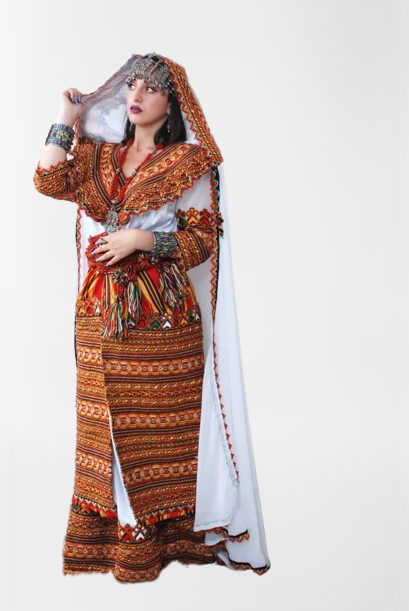 Somptueuse robe kabyle avec son barnous, sa fouta et sa ceinture. Idéal pour plongez dans l’élégance et la beauté de la tenue traditionnelle kabyle.