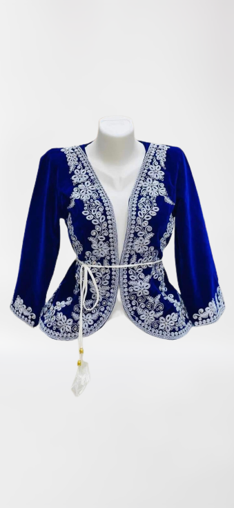 Sublime veste de KARAKOU bleu roi moderne avec des ornements argentés.